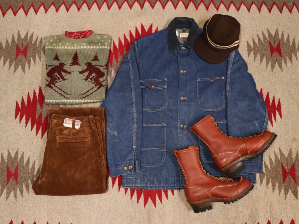 秋冬の着こなしに活躍するデニムのカバーオールは、10ozデニムにライニングが付いているので暖かく、襟元のコーデュロイもアクセントになり、Gジャンとはまた違った着こなしを楽しめます。ボトムスは、秋冬コーデの定番コーデュロイパンツ。1940年代のデザインは、太さのあるシルエットですが、クッシュマンのパンツの良さは、腰回りがダボつかないのでスッキリとしたシルエットです。