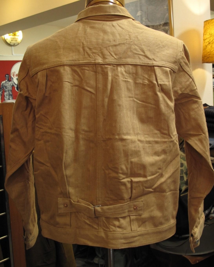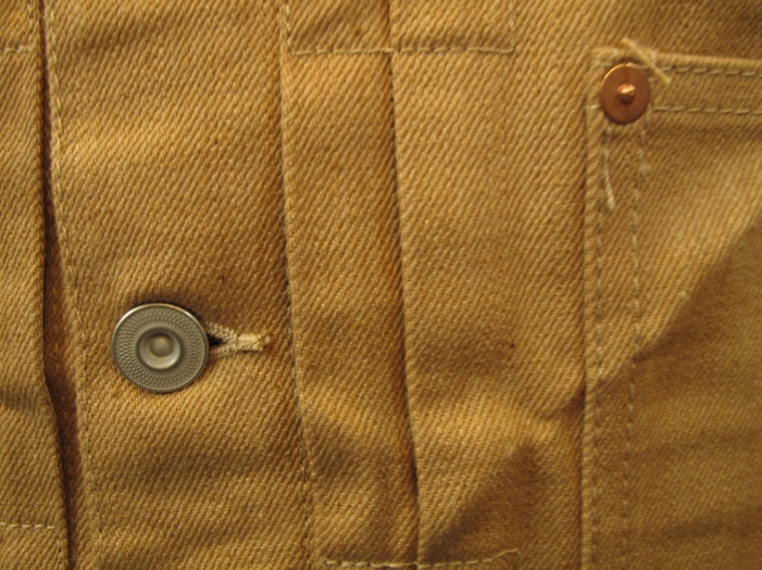 打ち抜きリベットで補強されたベース型のポケットが左下に付き、フロントボタンは、4つボタン、メタルのタックボタンを使用。